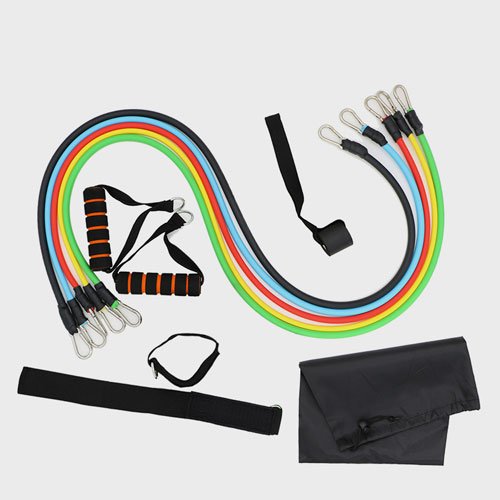 Product name; 11-piece pull rope set Product materials; TPE Product size; pull rope length 1.2 meters Tensile parameters; yellow 10 pounds, green 15 pounds, red 20 pounds, blue 25 pounds, black 30 pounds Product color; red yellow blue green black 5 color set Suitable for the crowd; male female old young Product function; weight loss. Fitness. Body shaping. Strength. Training Product configuration; 2 handles 2 foot sets 1 door buckle 1 net bag 5 drawstrings Packing size; 25 sets of one box 45cm * 35cm * 33cm Product weight; set of 450 grams Product description; this multifunctional elastic rope is your best choice. It has the same training method as dumbbells, and it is very easy to carry. It can be used on foot or fixed on the door. It is strong enough to stimulate your muscles. Use elastic rope to train your muscles has been in a state of tension and force, the best choice for weight loss. Fitness. Body shaping.